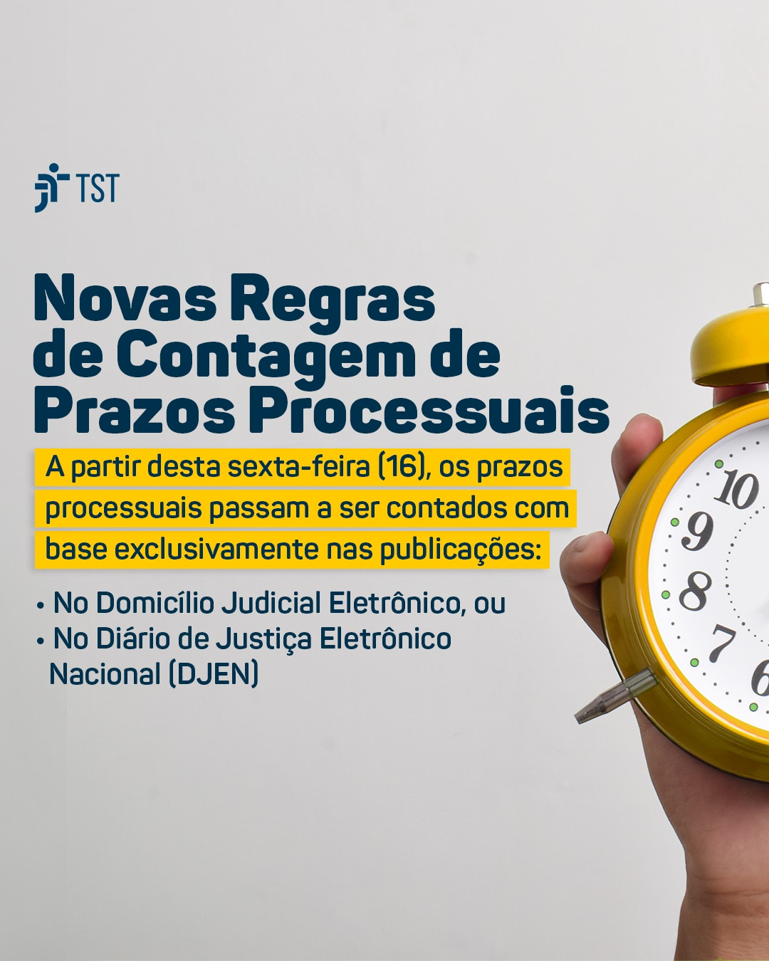 Novas regras para a contagem de prazos processuais começam a valer na sexta-feira, dia 16. Essas mudanças visam simplificar e tornar mais eficiente o andamento dos processos na Justiça. Com as novas diretrizes, a contagem dos prazos será feita de maneira mais clara, ajudando a evitar confusões e atrasos. É importante que todos os trabalhadores e associados do sindicato fiquem atentos a essas alterações, pois elas podem impactar diretamente a tramitação de processos que envolvem seus direitos. As novas regras buscam garantir que todos tenham um tratamento mais justo e ágil dentro do sistema judicial. Portanto, é fundamental que todos se informem sobre como essas mudanças podem afetar seus casos e estejam preparados para se adaptar a essa nova realidade.